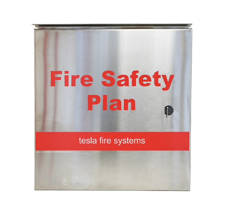 Our experienced engineers, after having completed a walk through of your building, will design your Fire Safety Plan and note any violations discovered during the inspection.  All Tesla Fire Systems Fire Safety Plans come professionally bound and laminated for are safe keeping at the building in a designed Fire Safety Plan Box. (Please see below)